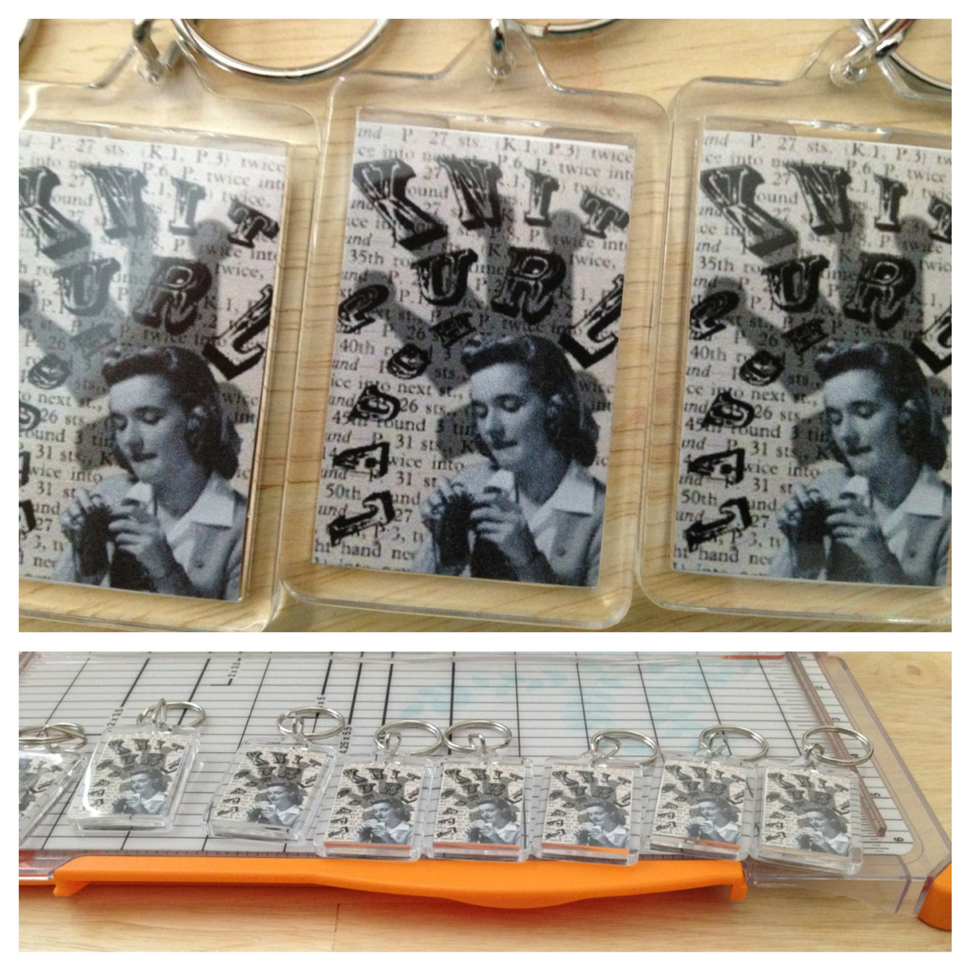 It’s my knitting group’s 10th anniversary this year. I can hardly believe we’ve been meeting weekly for so long. If you don’t have a knitting circle, I highly recommend joining or starting one. You’ll meet wonderfully interesting and diverse people, plus get help for those dropped stitches. For our celebration party, I decided to assemble swag bags for everyone, including some keychains with a collage I made. I think the image pretty much sums up our get-togethers – knit, purl, laugh – and not necessarily in that order.